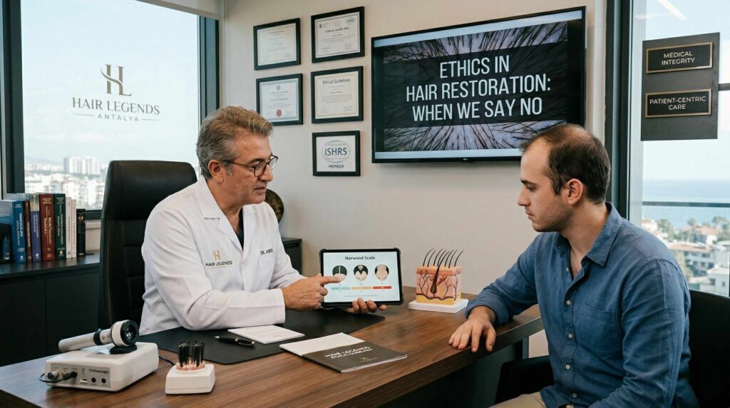 Ethics in Hair Restoration: In the modern era of the global hair transplant boom, the industry has shifted dangerously toward a retail driven model. Many clinics treat hair restoration as a simple commodity, where the only requirement for surgery is a patient’s willingness to pay. This “all comers” approach is the antithesis of medical ethics. At Hair Legends Antalya, we operate under a different mandate: we are medical professionals first and aesthetic consultants second. True expertise is not defined by the ability to perform a surgery; it is defined by the wisdom to know when a surgery should not be performed.