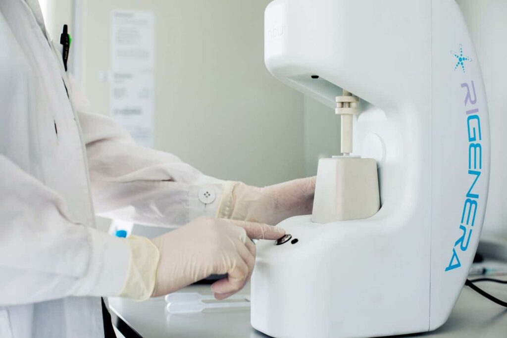 The harvested tissue is placed into the Rigeneracons device. This is a patented, highly sophisticated mechanical disaggregation system. It uses a calibrated grid to grind the tissue into a “liquid cell suspension.” This process is purely mechanical; no chemicals or enzymes are added, preserving the “Legendary” purity of the biological material. The result is a highly concentrated “Stem Cell Elixir” containing millions of viable progenitor cells ready for activation.